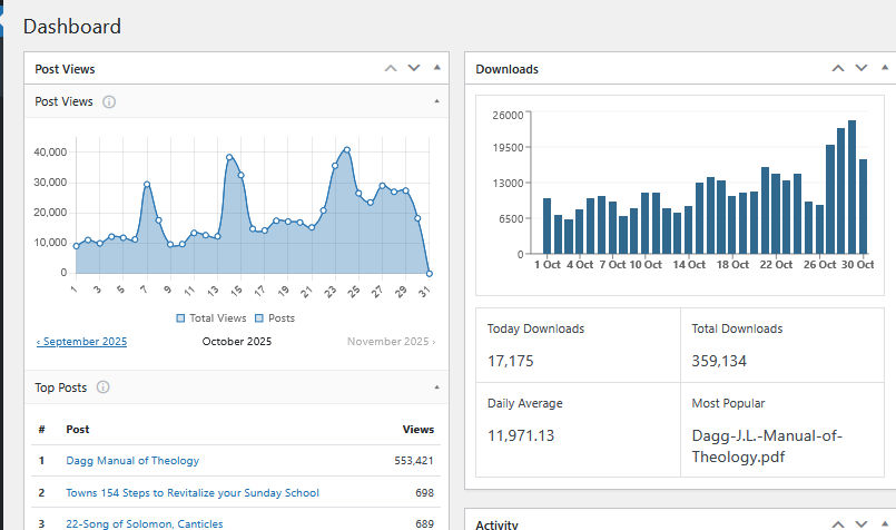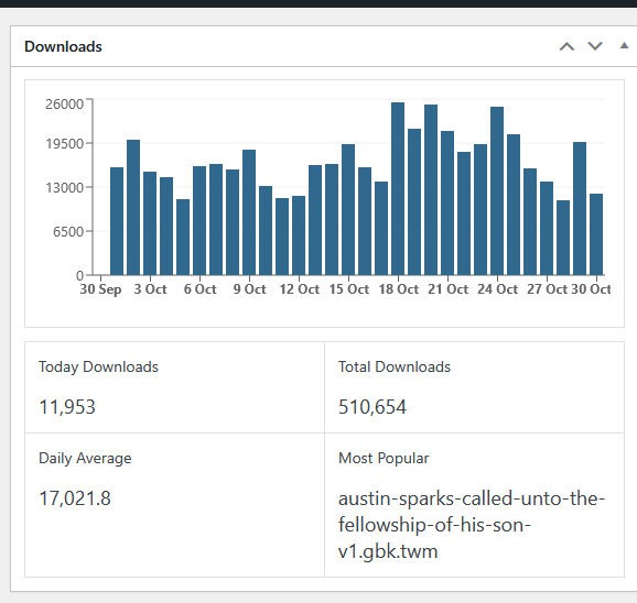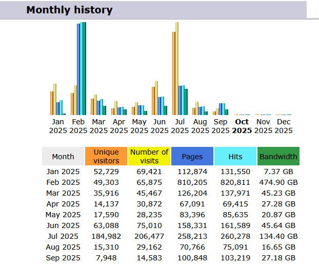 So let me interpret that image for you. First of all, this is not the number of visitors but the number of download files that have been downloaded. The bottom portion is “Today Downloads” downloads today, October 30, 2025. The “Total Downloads” number 510,654, is since I have reset the download statistics counters, which was on October 28, 2025. At that point, the total downloads was at 2,597,805 downloads. So there was a problem at the server level, and somehow they copied over my present website with a copy dating back to May 15, 2025. This happened sometime in August. The statistics on August 20 were at 2,597,805, and they were reset when the site was copied over with the May image to 1,620,221 total downloads. Remember that the site was hacked, and I restored it some three times last year in August. After I think I defeated how they were getting into the administration side of the website, I let it sit doing very little until December. No more hacks, so I started the website over in December with a few hundred downloads uploaded from August 2024 to November 2024.