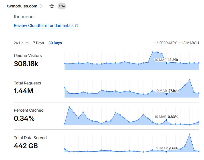 We had 308,000 unique visitors, which made 1.44 million requests. A request is for everytime you click on something and a page or download is done. Our traffic during this time was 442 GB, or about a half a terabyte of downloads per these 30 days. On March 15th, we had a peak of traffic that totaled 126 GBs on that single day.