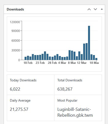 So in this image capture of the download traffic (which a download is a file or module that is downloaded by a user, (and there is a slight amount of traffic in html pages, but that is very little actually), you can see that the downloads for March 18 so far is 6,022, and for the 30 days previous, the total is 648,267 thousand. The daily average is 21 thousand. You can see the peak on March 15, which had 105,214 downloads ON THAT DAY ALONE! Our daily average is between about 15 thousand to 30 thousand. Our daily visitors are only averaging about 200 people per day. Around March 15th we had a lot visitors for 5 days with the peak reaching 1200 visitors on one day.